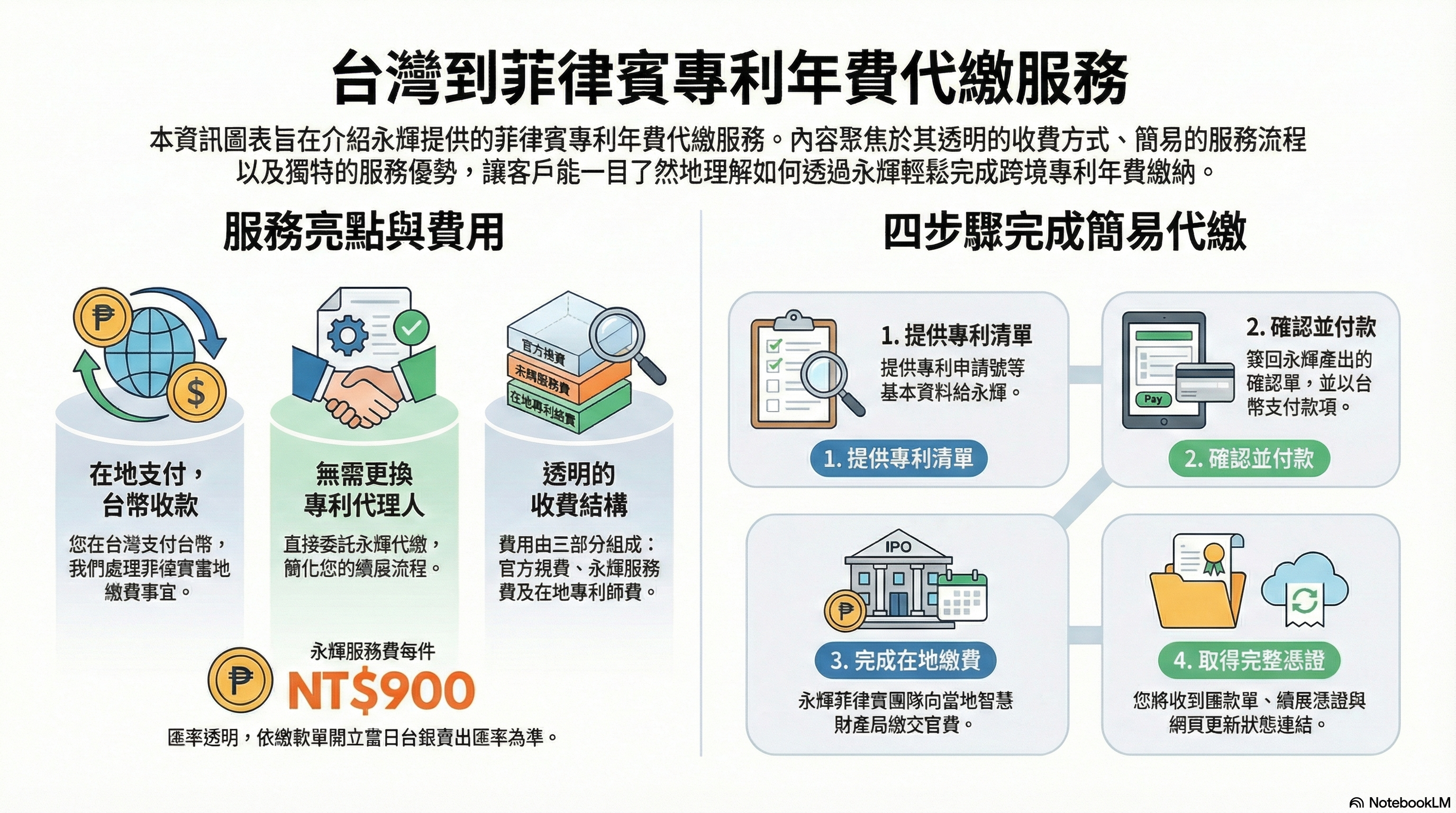菲律賓專利規費外,永輝每件服務費900元台幣(不含稅)+在地專利師Local Patent Agency Fee。